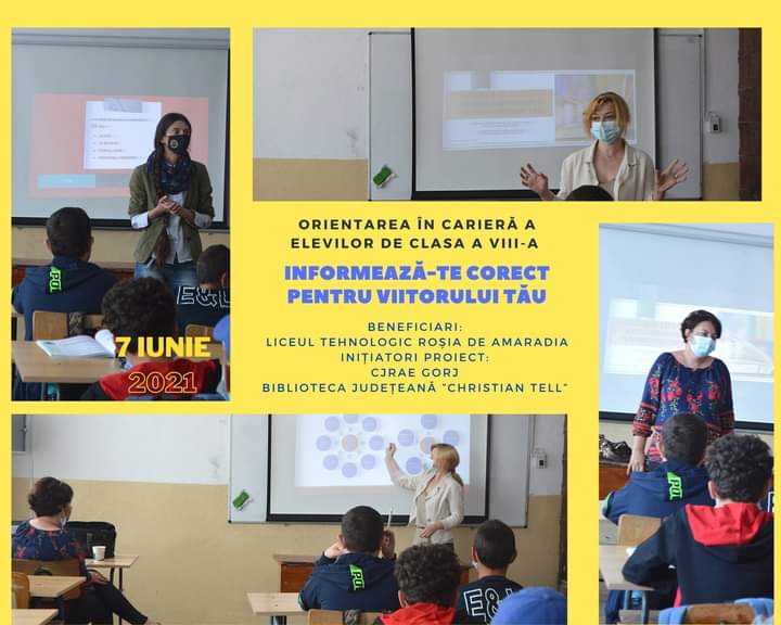 Luni, 7 iunie 2021, s-a desfășurat ultima activitate în cadrul proiectului „Informează-te corect pentru viitorul tău”, inițiat de Biblioteca Județeană ”Christian Tell”, în parteneriat cu CJRAE Gorj. De această dată, beneficiarii activităților derulate au fost elevii de clasa a VII-a și a VIII-a de la Liceul Tehnologic Roșia de Amaradia. „Activitățile au fost susținute de doamna prof. consilier școlar Gorun Sonia-Isabela și doamna profesor consilier școlar Țucă Irina – Monica. Cele două teme ale activităților: „Alegerea liceului – o decizie importantă pentru viitorul tău!” și „Viitorul tău – poveste de succes!”. Scopul acestor activități a fost acela de a orienta cât mai eficient elevii în carieră, în luarea unor decizii privind alegerea liceului, folosindu-se o serie de informații și instrumente psiho-sociologice. Mulțumim tuturor celor implicați în proiect!”, au transmis organizatorii.