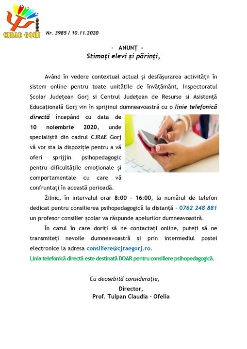 Centrul Județean de Resurse și Asistență Educațională Gorj a anunțat că, începând de astăzi, părinții și elevii gorjeni au la dispoziție un număr de telefon dedicat pentru consiliere psihopedagogică la distanță – 0762 248 881. Zilnic, în intervalul orar 08:00 – 16:00, la numărul de telefon menționat mai sus va răspunde un profesor consilier școlar, care va oferi sprijin psihopedagogic pentru dificultățile emoționale și comportamentale cu care se confruntă elevii și părinții în această perioadă. Cei care doresc să ia legătura online cu specialiștii din cadrul CJRAE Gorj pot face acest lucru prin poșta electronică, la adresa consiliere@cjraegorj.ro.
