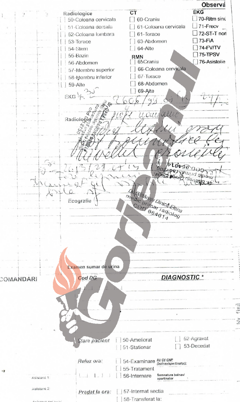 Acesta a rămas câteva ore în Spitalul Novaci unde a primit îngrijiri medicale apoi a fost trimis la Târgu-Jiu, pentru raze şi analize compexe. Luni dimineaţa, la câteva ore după incident, radiologul îi confirma omului că are leziuni la nivelul craniului în timp ce medicul orelist îi trecea în foaie că are traumatism la nivelul ochiului, urechii stângi şi a mandibulei.