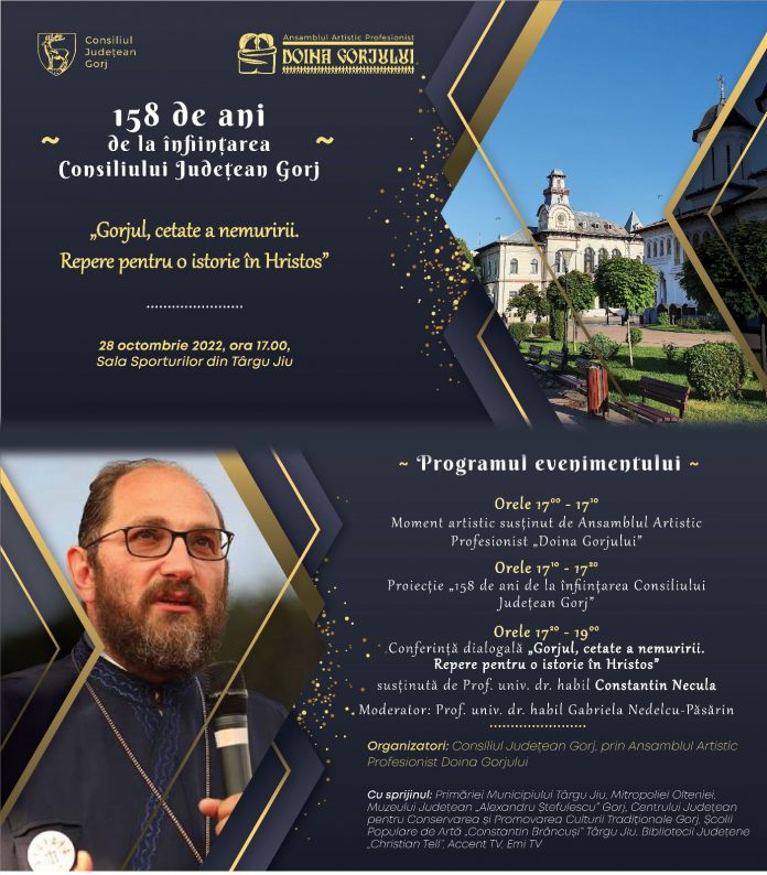 În cursul aceleiaşi zile, începând cu ora 17.00, la Sala Sporturilor din Târgu Jiu, va avea loc conferinţa tematică „Gorjul, cetate a nemuririi. Repere pentru o istorie în Hristos”. „Astfel, ne dorim să aducem mai aproape de inimile gorjenilor cultura, tradiţiile şi istoria locală, prin cuvintele preotului profesor Constantin Necula, invitat special al evenimentului”, susțin reprezentanții CJ Gorj.