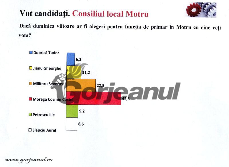 Sondajul, cel puțin ultimul realizat în localitate, mai exact de CCSB, în perioada 22-27 ianuarie 2016, fiind vizată pentru realizarea acestuia ,,populația adultă din municipiului Motru și localitățile rurale aferente”, el fiind realizat pe un eșantion de 675 de persoane, având o marjă de eroare tolerată la 2,6%, la un nivel de probabilitate de 95%(eșantionul fiind validat pe baza datelor INS), îi taie însă total din avânt lui Tudor Dobrică. Asta deoarece în sondajul respectiv, ajuns ieri și în posesia Gorjeanul, Tudor Dobrică are doar 6,2% din preferințele de vot ale electoratului, în timp ce Cosmin Morega are 42,3%. În același sondaj, la întrebarea ,,dacă duminica viitoare ar fi alegeri pentru funcția de primar la Motru pe cine veți vota?”, candidatul PNL Motru, Gheorghe Jianu a obținut numai 11,2%, în timp ce Militaru Severus a luat 22,5%, fiind preferat în fața tânărului stabilit deja candidat al organizației.