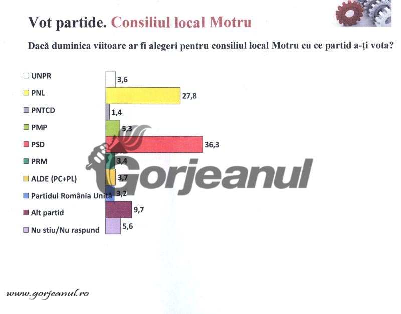Potrivit sondajului CCSB, motrenii ar prefera tot PSD și pentru Consiliul Municipal, 36,3% din repondeți spunând că ar vota ,,dacă duminică ar fi alegeri locale” pentru aleșii social-democrați. 27,8% dintre repondenți au spus, în schimb, că ar vota pentru PNL în timp ce 5,3% și-ar da votul Mișcării Populare. UNPR-ul ar fi preferat de 3,6% dintre cetățenii urbei conduse încă de către Dorin Hanu, PNȚCD-ul de 1,4%, PRM-ul de 3,4%, ALDE de către 3,7%, Partidul România Unită de 3,2%, în timp ce 9,7% ar vota un alt partid decât cele menționate. Doar 5,6% dintre repondenți au spus că nu știu cu cine ar vota duminică, o parte refuzând să răspundă la întrebarea din sondaj.