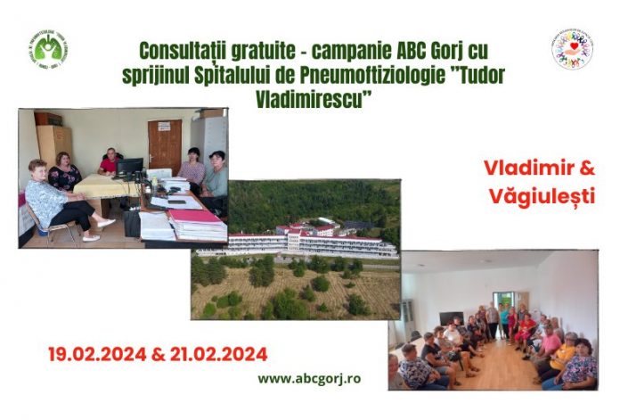Campania se derulează în această lună în două comune din Gorj. La Vladimir, evenimentul organizat de către ABC Gorj va avea loc în data de 19 februarie, ora 14:00, în cadrul Centrului de zi „Scoica” (Andreești), iar în comuna Văgiulești, consultațiile sunt programate pentru data de 21 februarie, ora 14.00.