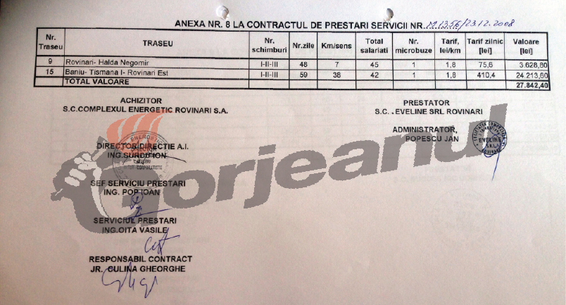 Sindicalistul Jean Popescu, administratorul SC Eveline SRL Rovinari, a făcut parte până, nu demult, din FNME, mai exact din sindicatul lui Constantin Mitrescu. Acesta s-a repliat însă, pentru a-şi apăra interesele personale, şi a trecut, în 2014, în tabăra SMEO, adică la sindicatul lui Căldăruşe, mai vine văzut de administraţia CEO, crede Creţan. Jean Popescu nu s-a mulţumit doar să schimbe sindicatul pentru a-şi proteja afacerile, existente chiar din anul 2008 cu Complexul Energetic Rovinari, după cum se arată din anexa nr. 8 la contractul de prestări servicii semnat la momentul respectiv de actualul negociator, pe care îl publicăm mai jos, ci a cerut să fie chiar titular al SMEO în comisia de negociere a noului CCM, comisie formată din 13 sindicalişti. Acest lucru îi irită pe unii colegi din comisia de negociere, cu atât mai mult cu cât, la vârful CEO se ştie că la adresa lui Jean Popescu s-au depus încă din 2013 mai multe plângeri legate de afacerile sindicalistului cu structura energetică. De altfel, activitatea lui Popescu a ajuns în atenţia Corpului de Control al CEO în 2013, dar sindicalistul a scăpat de repercusiuni, schimbând, între timp, şi sindicatul.