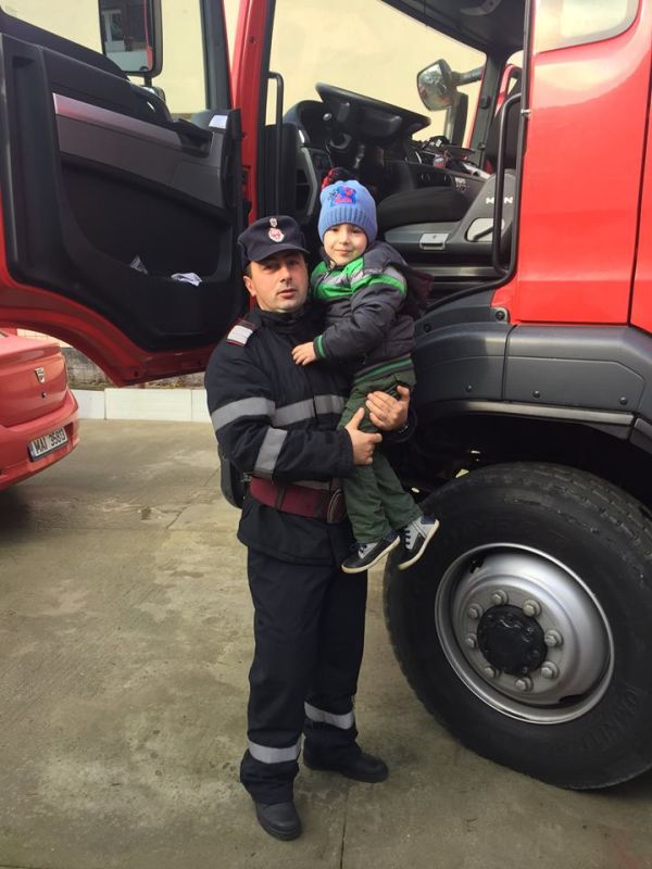 Încă de la sosirea noastră, Narcis, un tânăr domn de numai cinci anişori, a luat rolul liderului echipei de cercetare a tehnicii de intervenţie şi a supus echipajul nostru la un interviu despre toate funcţiile autospecialei de pompieri. S-a arătat foarte interesat de această meserie, iar ca răsplată pentru răspunsurile primite ne-a recitat poezii, ne-a cântat şi ne-a dansat.