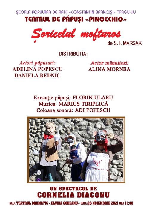 Duminică, 28 noiembrie, ora 11.00, copiii sunt invitați la Teatrul Dramatic ”Elvira Godeanu” din Târgu-Jiu, la spectacolul ”Șoricelul mofturos”, de Cornelia Diaconu. Personajelor le vor da viață actorii păpușari: Daniela Rednic, Adelina Popescu, Alina Mornea. Biletele se pot achiziționa înainte de începerea reprezentației, prețul unui bilet fiind de 7 lei.