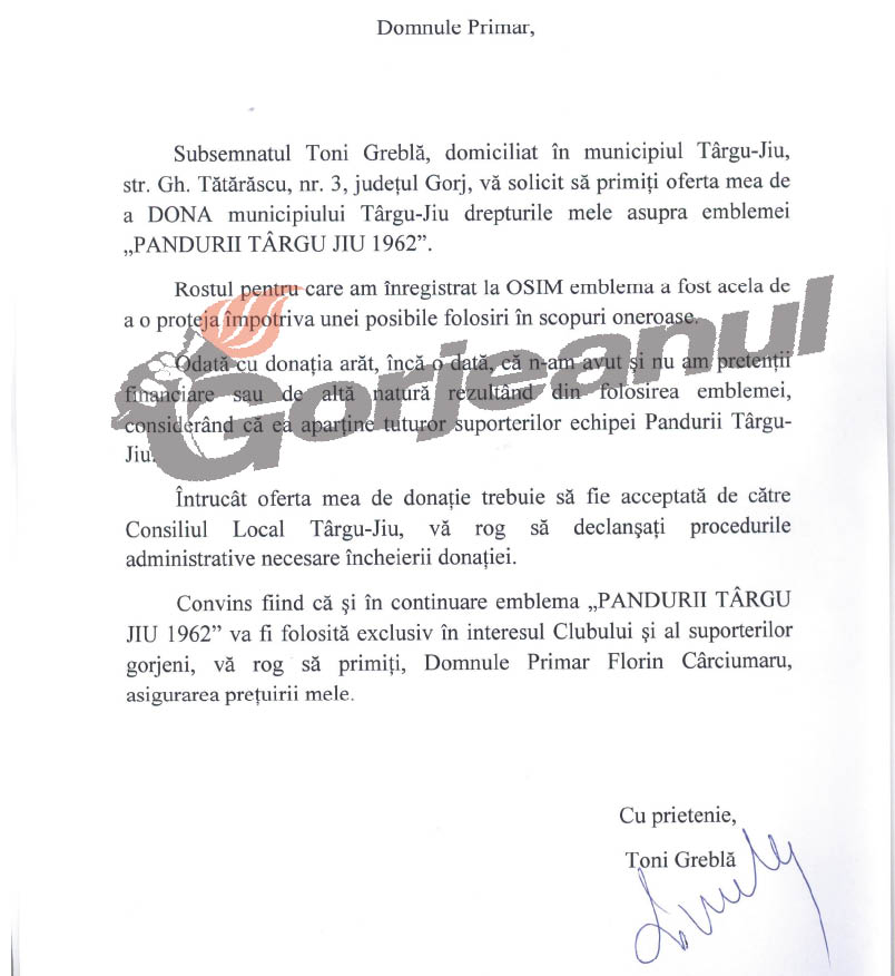 În interesul Clubului Pandurii şi a suporterilor, fostul senator de Gorj, Toni Mihail Greblă, a făcut un prim pas important pentru a dona drepturile sale asupra emblemei Pandurii, municipalităţii. Conform procedurii, acesta a adresat ieri dimineaţă o scrisoare primarului municipiului Târgu-Jiu, Florin Cârciumaru, prin care îşi anunţa intenţia clară de a dona municipalităţii drepturile sale asupra emblemei “Pandurii Târgu-Jiu 1962”.