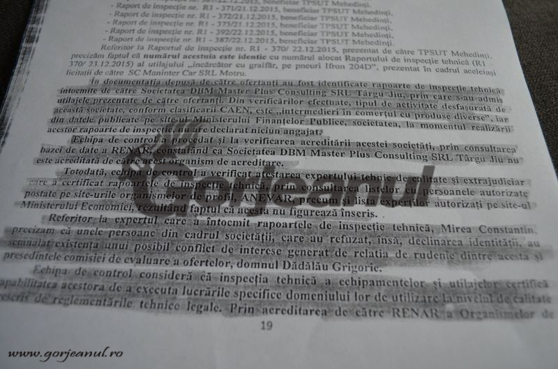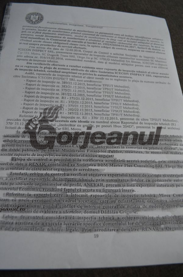 Control, se transmit la minister de către Societatea de Inspecție Tehnică ICECON Inspect SRL rapoartele de inspecție ale patru dintre firmele aflate în asociația TPSUD. “Din verificările efectuate a rezultat însă existența unor rapoarte de inspecție tehnică ale căror număre nu se regăsesc în plaja de numere atribuite de SC ICECON INSPECT SRL rapoartelor de inspecție tehnică, existând suspiciuni cu privire la autenticitatea acestora”, se arată în raportul de control. Neregulile privesc 10 astfel de rapoarte de inspecție pentru societățile TPSUT Mehedinți și MANITER CAR SRL. “În documentația depusă de către ofertanți au fost identificate rapoarte de inspecție tehnică întocmite de către SC DBM Master Plus Consulting SRL Târgu-Jiu, prin care s-au admis utilajele prezentate de către ofertanți. Din verificările efectuate, tipul de activitate desfășurat de această societate, conform calificării CAEN este de,,intermedieri în comerțul cu produse diverse”, iar din datele publicate pe siteul Ministerului Finanțelor Publice, societatea, la momentul realizării acestor rapoarte de inspecție, nu avea declarat niciun angajat. Echipa de control a procedat și la verificarea acestei societăți, prin consultarea bazei de date RENAR, constatând că societatea din Târgu-Jiu nu este acreditată de acest organism’’, se subliniază în raportul de control.