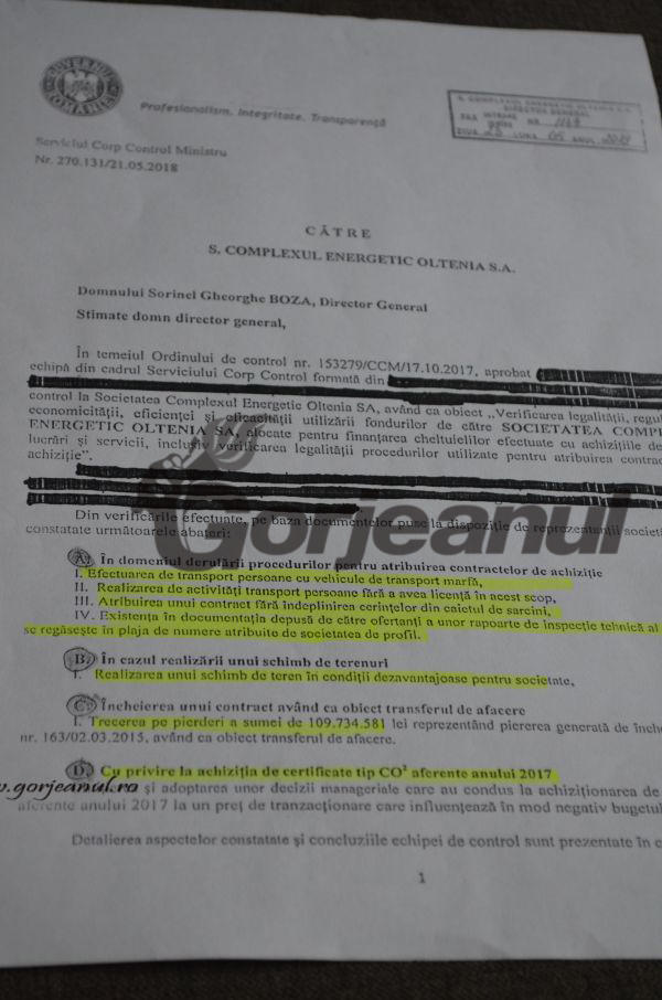 ministru ALDE, Anton Anton. Cert este că Serviciul Corp Control înregistrează cu numărul 270 pe 21 mai acest raport, care ajunge să fie trecut în registrul de intrări la CE Oltenia cu nr.1149, pe 23 mai 2018. Despre raport, dar și despre măsurile care se impun ca urmare a neregulilor care au fost depistate aici, administrația CEO nu a suflat niciun cuvânt, în ciuda transparenței pe care spune că o afișează pe site-ul propriu, asta deși a trecut aproape o lună de când documentul se află pe masa lui Boza și a Directoratului companiei.