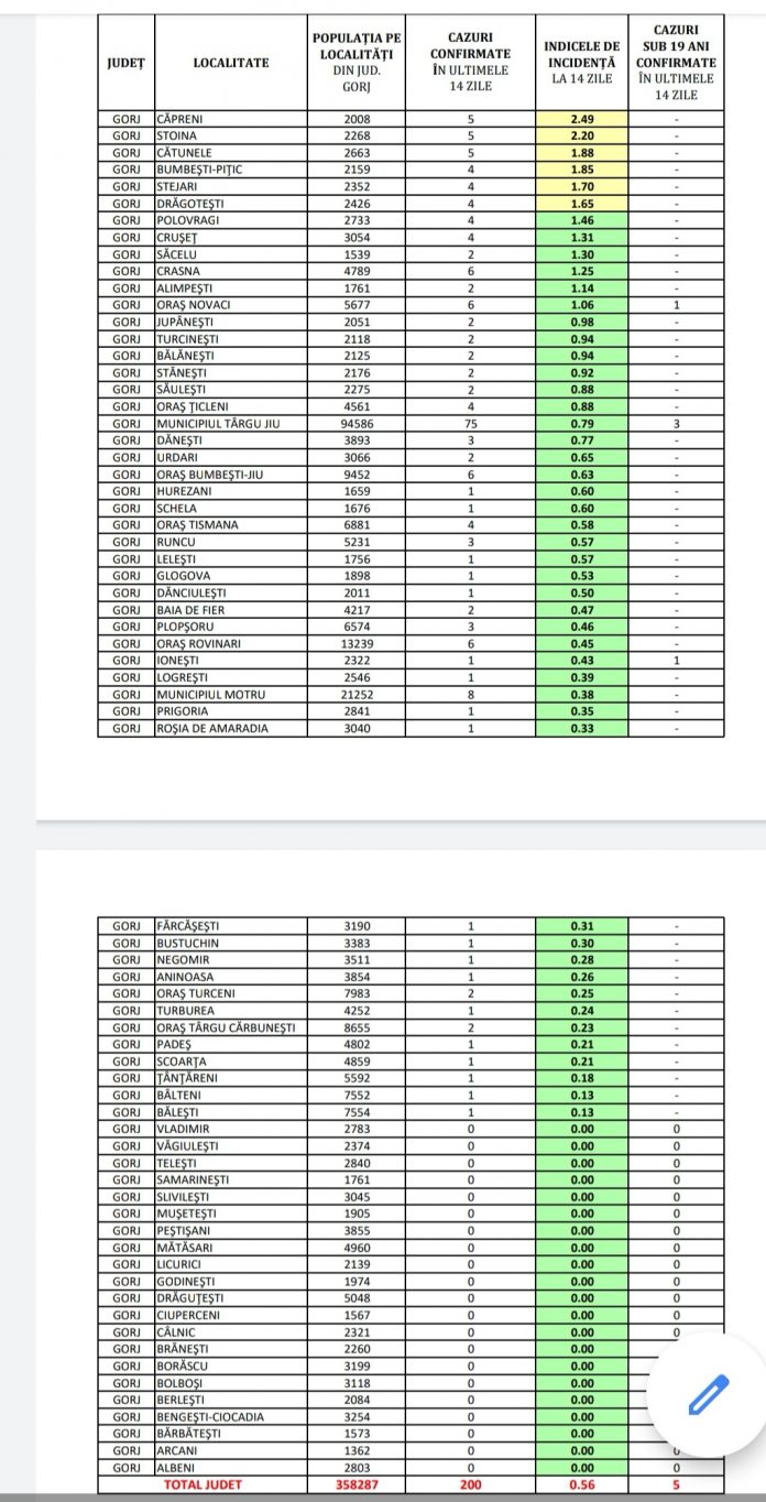 COVID-19: 6 localități din Gorj, în scenariul galben