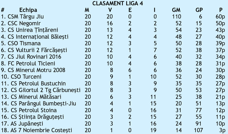 S-au dat goluri multe la județ în etapa a 20-a din Gorj. Liderul CSM Târgu Jiu a reușit scorul rundei la Rovinari, 0-6 cu Bălești, performanță izbutită și de Unirea Țînțăreni, care nu a avut milă, acasă, de fotbaliștii de la Bumbești Jiu. De altfel, după cele două rezultate, Țînțăreni s-a instalat pe podium, cu trei puncte avans față de Internațional.