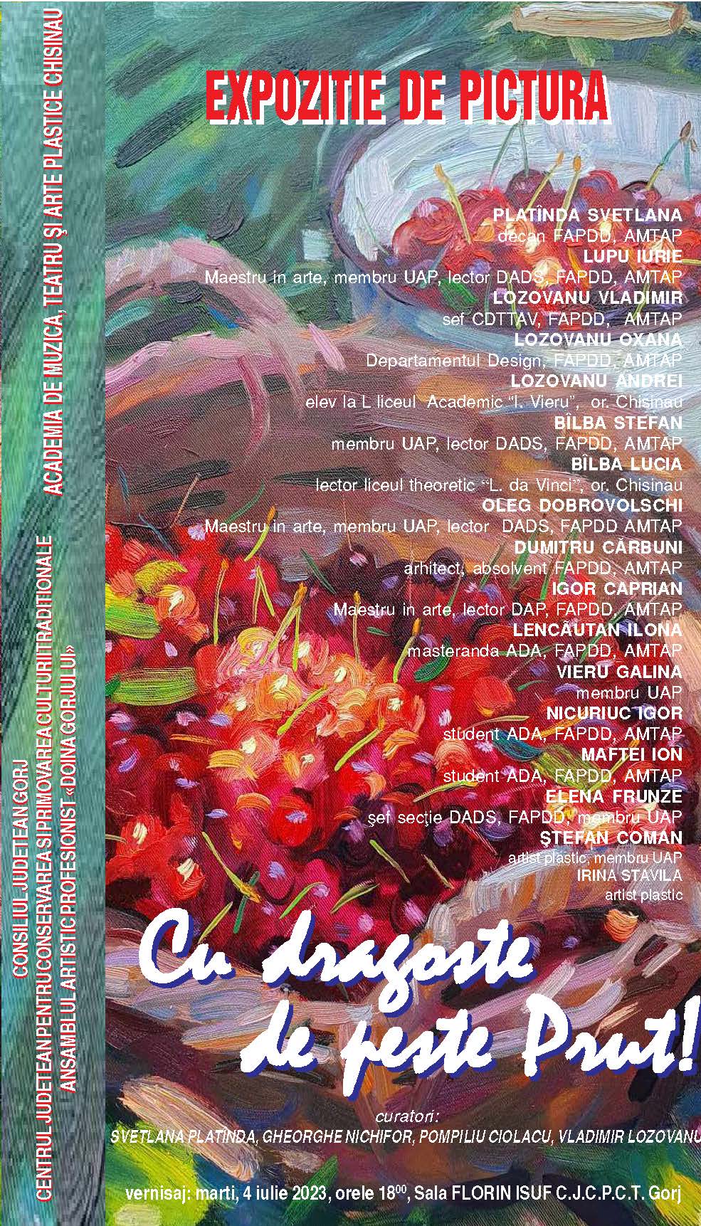 Consiliul Județean Gorj, Centrul Județean pentru Conservarea și Promovarea Culturii Tradiționale Gorj, Ansamblul Artistic Profesionist „Doina Gorjului” și Academia de Muzică, Teatru și Arte Plastice Chișinău, anunță vernisajul expoziției de pictură „Cu dragoste de peste Prut”, care va avea loc marți, 4 iulie 2023, la sala „Florin Isuf”, începând cu ora 18.00.