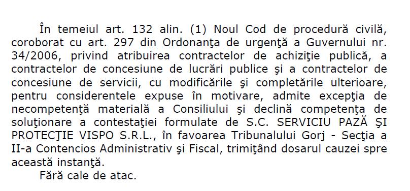 d1 d2 d3Pe 10 februarie CNSC decide următoarele: “admite excepţia de necompetenţă materială a Consiliului (n.r. CNSC) şi declină competenţa de soluţionare a contestaţiei formulate de SC Serviciul Pază şi Protecţie VISPO SRL, în favoarea Tribunalului Gorj – Secţia a II-a Contencios Administrativ şi Fiscal, trimiţând dosarul cauzei spre această instanţă”.