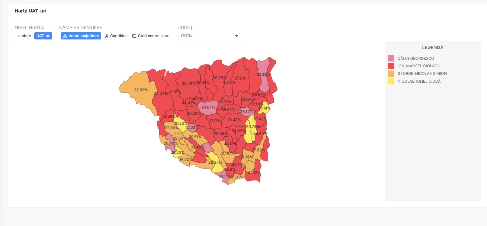 Candidatul suveranist a mai ieșit câștigător în comunele Ionești (30,10%), Urdari (27,61%) și Albeni (27,47%). De altminteri, acesta a smuls voturi importante în toate localitățile din Gorj, la nivel de județ reușind să adune aproape 33 de mii de voturi, cu 3.855 mai puține decât Marcel Ciolacu – 36.836 voturi.