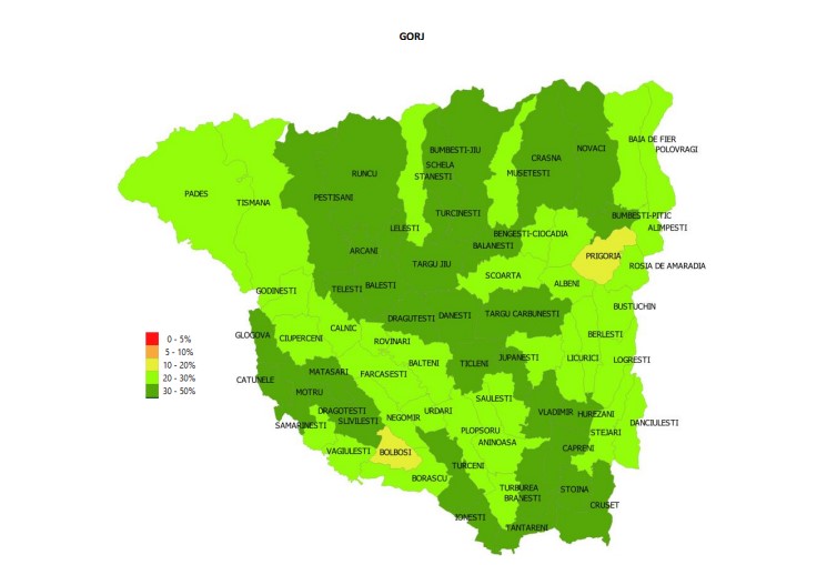 Patru localități din județul Gorj au un prag de vaccinare mai mare de 40%. Este vorba de municipiul Târgu-Jiu, comuna Arcani, orașul Țicleni și municipiul Motru. La polul opus se situează comunele Bolboși și Prigoria, gradul de vaccinare fiind mai mic de 20%.