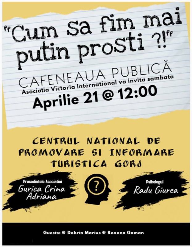 Sâmbătă, 21 aprilie 2018, Asociația „Victoria International” (A.V.I.) a organizat, începând cu ora 12.00, Cafeneaua Publică cu tema „Cum sa fim mai puțin proști?!”. Evenimentul, la care au participat tineri și cadre didactice, s-a desfășurat la Centrul Național de Informare și Promovare Turistică „Constantin Brâncuși” din Târgu-Jiu, fiind moderat de tânărul psiholog Radu Giurea. Acesta a prezentat, alături de președintele A.V.I., prof. Crina Adriana Gurică, câteva modalități de dezvoltare personală. Printre invitați s-au numărat Marius Dobrin și Roxana Găman, care au împărtășit din proiectele lor celor prezenți.