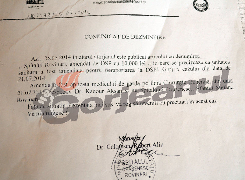 Cazul bebeluşului înregistrat ca şi decedat la Spitalul Rovinari, făcut public, săptămâna trecută, de Gorjeanul nemulţumeşte conducerea unităţii medicale care preferă să se războiască în scris cu publicaţia în loc să îşi clarifice problemele interne şi cele externe cu Direcţia de Sănătate Publică Gorj şi cu Ministerul Sănătăţii. Supărat că DSP-ul a făcut public în mass-media că Spitalul Rovinari a fost amendat pe motiv că unitatea nu a anunţat incidentul, conform legii, către această instituţie şi către MS, managerul Robert Calotescu a preferat să transmită doar la Gorjeanul un aşa-zis “comunicat de dezminţire” care contrazice informaţiile apărute însă în două cotidiene locale, având ca sursă o declaraţie a purtătorului de cuvânt al DSP Gorj. Comunicatul purtând semnătura şi parafa managerului, pe lângă faptul că, după cum se vede mai jos, conţine greşeli de scriere(n.r. Gorjanul în loc de Gorjeanul) arată că spitalul nu îşi asumă eroarea amendată, preferând să arunce vina necomunicării cazului spre medicul sirian de gardă, care nu vorbeşte nici măcar corect limba română. Deşi se cer doar la Gorjeanul rectificări, în condiţiile în care şi o altă publicaţie a redactat întocmai punctul de vedere al DSP Gorj, în momentul în care a fost contactat telefonic pentru a fi întrebat de ce a cerut dezminţire preferenţial mai precis doar cotidianului nostru, managerul a dat înapoi cerându-ne să rupem documentul oficial. A recunoscut că problema sa este cu DSP-ul şi nu cu Gorjeanul, dar comunicatul scris i-a contrazis vorbele. Această atitudine nepotrivită funcţiei pe care o ocupă, a managerului Spitalului Rovinari, a nemulţumit de altfel şi la vârful DSP Gorj, nu numai la Gorjeanul.
