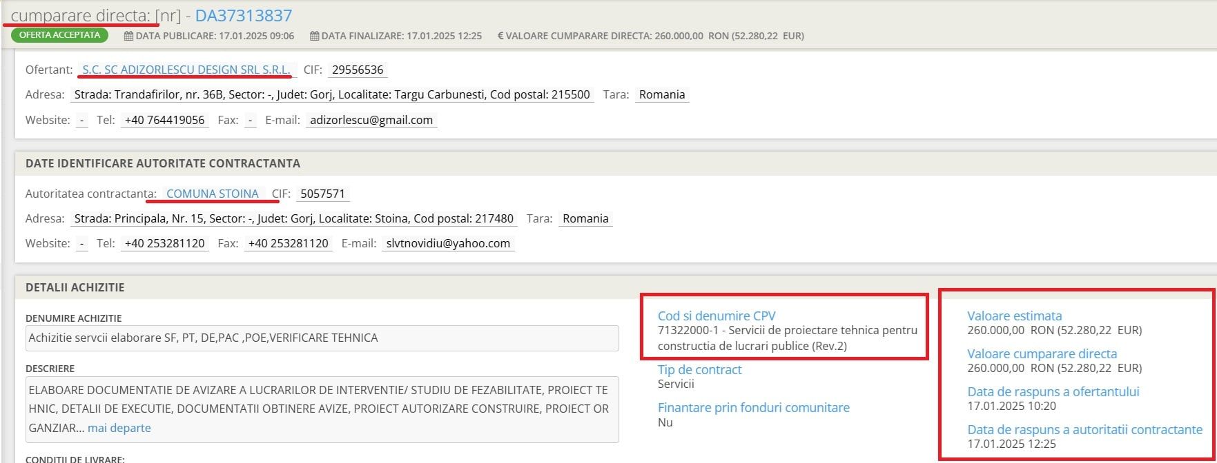 Cel mai mare dintre acestea, în valoare de 260.000 de lei, i-a fost atribuit direct firmei AdiZorlescu Design SRL, care aparține colegului de partid al primarului Fota, consilierul județean Adrian Zorlescu, fostul candidat AUR la funcția de președinte al Consiliului Județean Gorj.