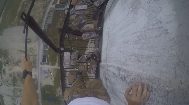 ”O să dedic această filmare pentru mama, pentru tata, pentru fratele meu, pent-ru prietena mea și toate neamurile ei invidioase. (…) O să vă arăt că pot! Urați-mi baftă să traversez la 256 de metri o grindă de metal, chiar să mă joc! Ca să rămâneți fără cuvinte o să vă arăt pe ce scară am urcat, legată cu plastic, cu drod, cu funie de legat vaci, scara se mișcă oricum. Suntem la răsărit, la Târgu-Jiu, e un spectacol (…)