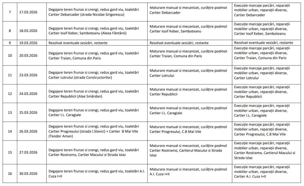 „Facem un apel către cetățenii care locuiesc în cartierele în care intervenim în această perioadă să elibereze locurile de parcare pentru a putea fi curățate și marcate corespunzător. Programul conform căruia se intervine a fost comunicat asociațiilor de proprietari”, au transmis reprezentanții municipalității.