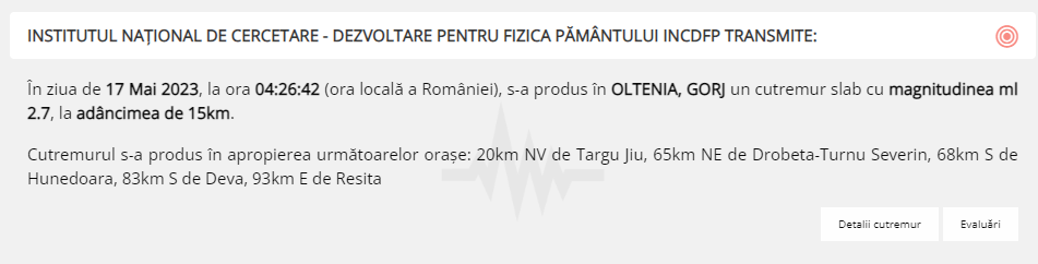 Un nou cutremur a avut loc în această dimineață, în Gorj. la ora 4.26. Acesta a avut magnitudinea 2,7 și s-a produs la adâncimea de 15 kilometri. Cutremurul s-a produs în apropierea oraşelor Târgu Jiu (20 km), Drobeta-Turnu Severin (65 km), Hunedoara (68 km), Deva (83 km), Reșița (93 km).