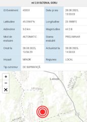 Un cutremur slab cu magnitudinea 2,8 s-a produs în Gorj, la ora 13:53.