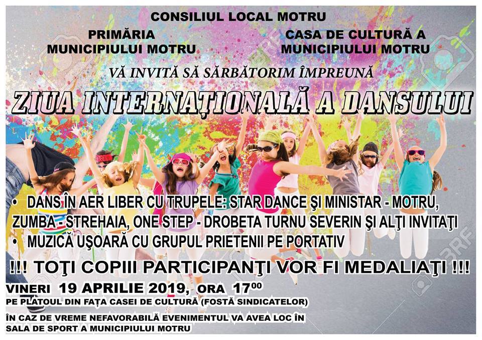 Ziua Internaţională a Dansului nu va trece neobservată la Motru. Primăria şi Consiliul Local, cu sprijinul Casei de Cultură, îi invită la distracţie pe toţi copiii din oraş, vineri, 19 aprilie, de la ora 17.00. Evenimentul are loc în aer liber, pe platoul din faţa Casei de Cultură Motru. Vor fi prezente trupele Star Dance şi MiniStar din Motru, Zumba din Strehaia şi One Step din Drobeta Turnu Severin. Atmosfera va fi întreţinută de Grupul vocal „Prietenii pe portativ”. Toţi copiii participanţi vor fi medaliaţi. „În caz de vreme nefavorabilă, evenimentul va avea loc în sala de sport a Municipiului Motru”, anunţă organizatorii.