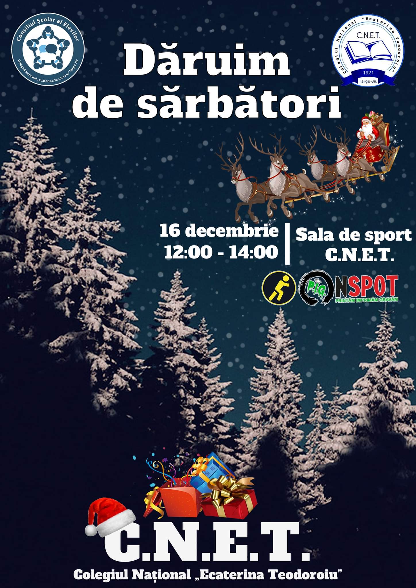 Consiliul Şcolar al Elevilor al Colegiului Naţional „Ecaterina Teodoroiu” va organiza campania caritabilă #Ofacem. Asta, la data de 16 decembrie între orele 12:00 – 14:00. Este vorba despre evenimentul caritabil „Dăruim de sărbători”, locul de organizare fiind sala de sport a colegiului. Prin organizarea acestui eveniment se urmărește strângerea de fonduri cât și de alimente neperisabile, hăinuțe, jucării, rechizite etc., asta de orice persoană care dorește să aducă o bucurie în sufletele acestor oameni. „Generozitatea se măsoară în fapte, iar în cazul nostru înseamnă zâmbetul acestor familii. Orice donație contează și este bine venită!”, anunță organizatorii.