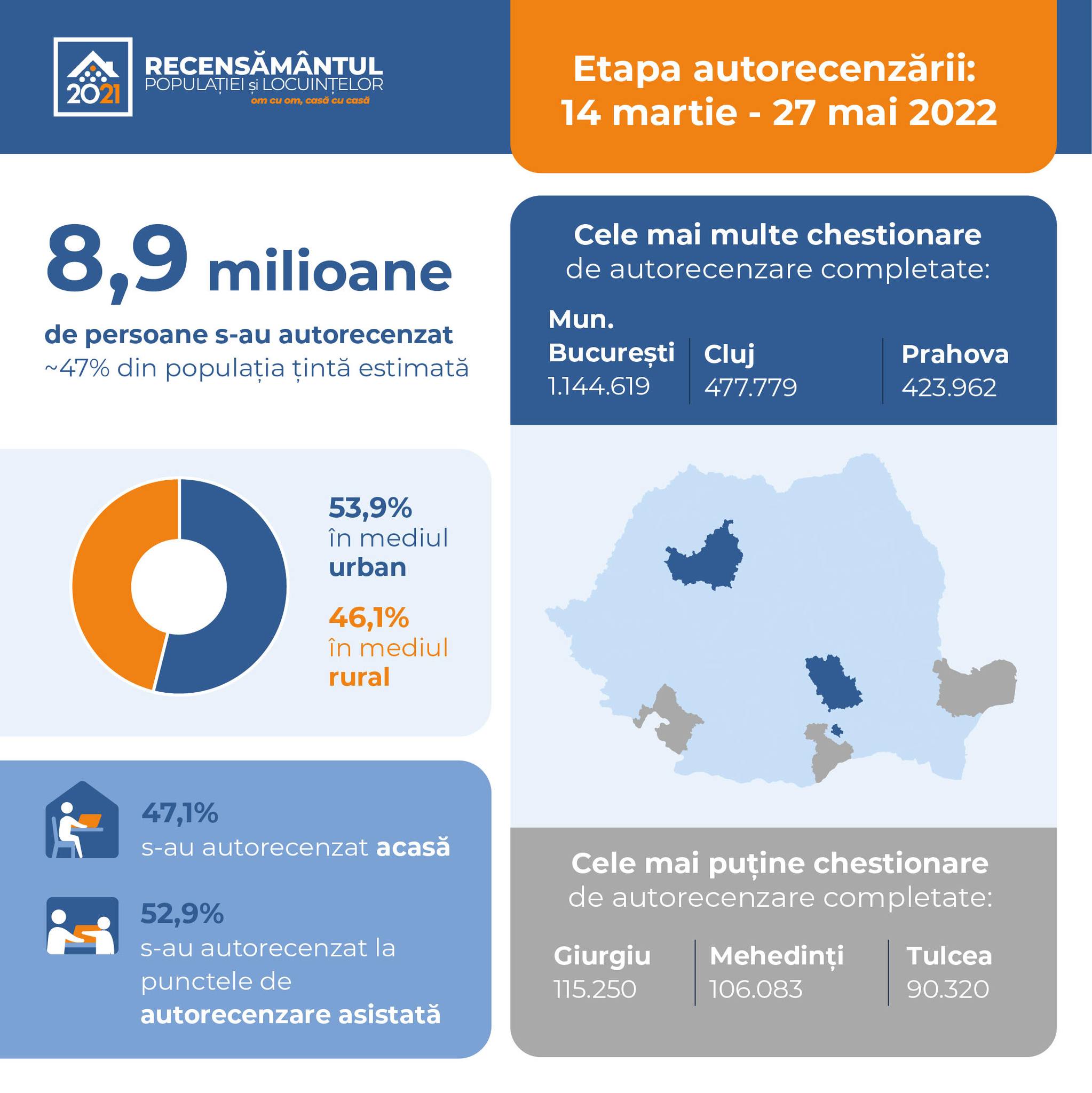 Aproape jumătate dintre români s-au autorecenzat. De astăzi, cei care nu au completat online chestionarul de recenzare vor fi vizitați acasă de recenzori. Colectarea datelor de recensământ se va realiza prin interviu faţă în faţă, cu ajutorul tabletelor. Vor fi vizitate și gospodăriile gorjenilor care nu au finalizat corect și complet chestionarele de recensământ, a anunțat Vasile Păunescu, directorul executive al Direcției Județene de Statistică Gorj.