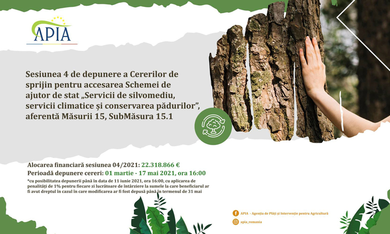 Agenția de Plăți și Intervenție pentru Agricultură (APIA) anunță lansarea sesiunii 4 de depunere a Cererilor de sprijin pentru accesarea Schemei de ajutor de stat aferentă Măsurii 15 „Servicii de silvomediu, servicii climatice și conservarea pădurilor”, SubMăsura 15.1 „Plăți pentru angajamente de silvomediu” din cadrul PNDR 2014 – 2020.
