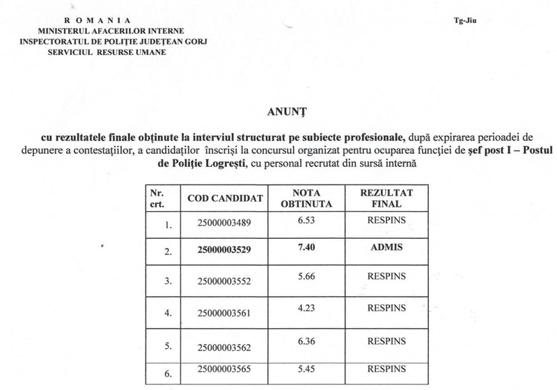 Ceilalți candidați au primit 4.23, 5.66, 6.36, 6.53 și 5.45. Un dosar a fost invalidat, pentru că persoana care s-a înscris nu a depus adeverința care să conțină rezultatul ultimului examen medical de bilanț, eliberată de medicul de unitate, cu mențiunea ,,apt medical promovare funcții de conducere”. De asemenea, potrivit comisiei de concurs, din dosar au lipsit curriculum vitae, modelul comun european și avizul psihologic, document pentru care candidatul nu s-a mai prezentat la evaluare. Potrivit anunțului postat pe portalul de servicii de la nivelul Ministerului Afacerilor Interne, o altă candidatură a fost validată, sub rezerva obținerii avizului psihologic, candidatul fiind replanificat pentru susținerea evaluării. Funcția de conducere de la Postul de Poliție Logrești a rămas vacantă, după ce fosta șefă s-a mutat la Investigații Criminale, la Târgu-Cărbunești. Andreea Șuvăr, agent principal, s-a mutat în interes de serviciu, de la începutul lunii iulie. Tânăra a condus Postul de Poliție Logrești, în perioada 01.11.2021-01.07.2025. În prezent, trei angajați își desfășoară activitatea în localitate. Interviul structurat pe subiecte profesionale s-a desfășurat la sediul IPJ Gorj, în data de 18 septembrie 2025. Candidații au susținut evaluarea psihologică, pe 20 august, la sediul Centrului de Psihosociologie, din municipiul București. Trei dintre ei au avut deja un aviz valabil, emis anterior. La examen au participat doar cei declarați ,,apt medical” şi ,,apt” la evaluarea psihologică, cei care nu se află sub efectul unei sancţiuni disciplinare sau faţă de care nu a fost pusă în mişcare acţiunea penală, cei care au obţinut calificativul de cel puţin ,,bine” la ultimele două evaluări anuale de serviciu și au îndeplinit toate condiţiile de vechime şi studii. Postul de Poliție Logrești este arondat Secţiei 8 Poliţie Rurală Stoina, coordonată de Poliţia Oraşului Târgu-Cărbunești.