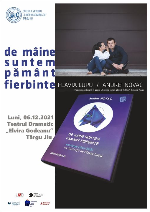 Astăzi, la ora 15:00, la Teatrul Dramatic „Elvira Godeanu” din Târgu Jiu va avea loc lansarea antologiei de versuri «De mâine suntem pământ fierbinte», autor Andrei Novac, grafica Flavia Lupu. Evenimentul este organizat de Colegiul Național „Tudor Vladimirescu” Târgu Jiu, în parteneriat cu Uniunea Scriitorilor din România, Uniunea Artiștilor Plastici din România, Editura Paralela 45, Inspectoratul Școlar Județean Gorj și Revista România Literară. „În incursiunea prin acest volum ne vor ghida elevii Silvana Băloniu, Ștefania Blidea, Irina Roibu, Alexandru Trifu-Urzică, Giulia Lungescu (la pian). Se vor respecta toate condițiile impuse în această perioadă pandemică; accesul în sala de spectacol se va face în baza certificatului verde”, au anunțat organizatorii.