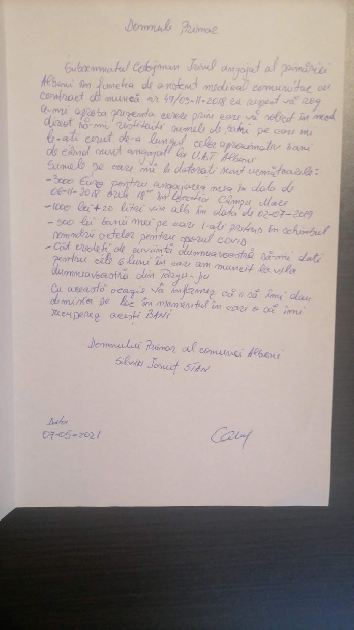 O cerere înaintată ieri primarului Silviu Ionuț Stan de către un asistent medical comunitar din cadrul Primăriei Albeni, face furori și creează atât amuzament, cât și revoltă pe rețelele de socializare. Angajatul îi cere edilului restituirea mai multor sume de bani, cum ar fi: 3.000 de euro solicitați pentru angajarea sa, plata celor 6 luni de muncă în care omul a prestat diverse activități la locuința primarului, cei 500 de lei pretinși în schimbul semnării actelor pentru sporul COVID-19, dar și 1.000 de lei și contravaloarea a 20 de litri de vin alb pe care salariatul i-a dat primarului în iulie 2019.