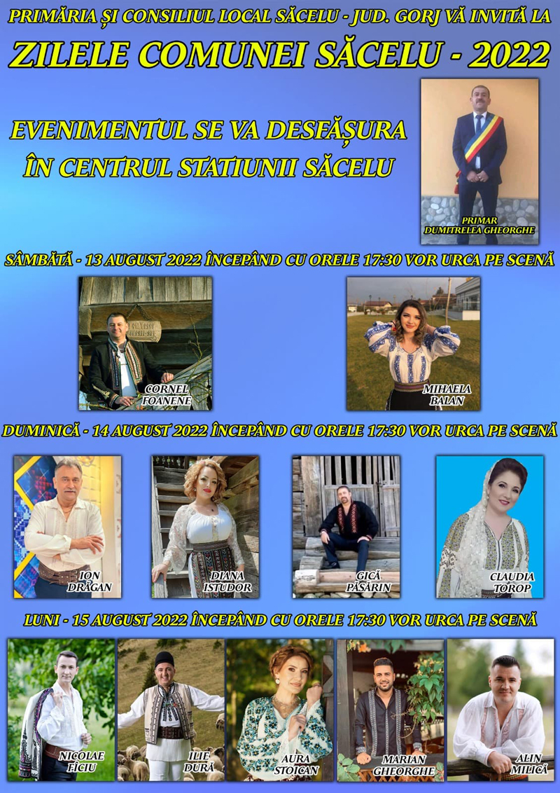 În perioada 13-15 august, la Săcelu se va organiza prima ediție a zilelor comunei. Timp de trei zile, autoritatea locală a pregătit pentru participanți întreceri sportive, premieri surpriză dar și momente artistice deosebite. 11 artiști vor încânta publicul în aceste trei zile de sărbătoare, prestația acestora fiind gratuită. Autoritatea locală a plătit scena, sonorizarea și luminile, spune primarul Gheorghe Dumitrelea care anunță că toți comercianții care vor să își vândă produsele cu ocazia acestei sărbători o pot face gratuit. Tarabele vor fi așezate în centrul localității pe strada care va fi închisă circulației rutiere. Autoritatea locală, condusă de primarul Gheorghe Dumitrelea, s-a implicat în organizarea acestei manifestări care va debuta la finalul acestei săptămâni, cu mențiunea că edițiile următoare vor fi mult mai grandioase, în funcție de banii care vor completa, pe viitor, bugetul local.