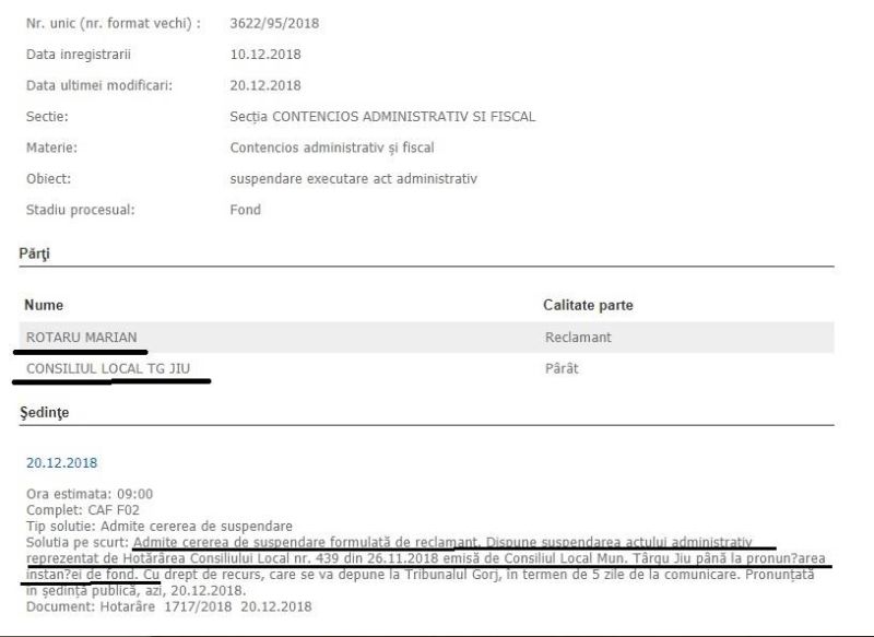 Tribunalul Gorj a admis, pe 20 decembrie a.c., acțiunea formulată de Marian Rotaru, directorul Direcției Publice de Patrimoniu, împotriva hotărârii Consiliului Local Tg-Jiu prin care acesta a fost destituit din funcție și a decis suspendarea actului administrativ, până la pronunțarea instanței de fond. Consilierii locali au adoptat, pe 26 noiembrie a.c., o hotărâre prin care Rotaru trebuia destituit din funcția de director executiv al DPP, proiectul fiind inițiat de consilierul PNL Eduard Berca și votat de majoritatea aleșilor, însă hotărârea nu a fost semnată de legalitate de secretarul Municipiului Tg-Jiu, Grigore Jianu.