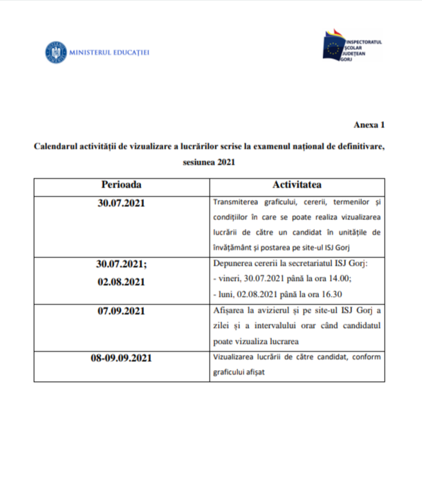 În conformitate cu prevederile art. 40, alin.(5) din OMEN nr.5434 din 31 august 2020, privind aprobarea Metodologiei-cadru de organizare și desfășurare a examenului național pentru definitivare în învățământul preuniversitar, publicat în Monitorul Oficial nr. 852 din 17 septembrie 2020, după afișarea rezultatelor finale, candidații pot solicita comisiei de examen să își vadă lucrarea, fără ca, în urma vizualizării, să obțină reevaluarea lucrării și/sau modificarea notelor acordate, a anunțat IȘJ Gorj. Candidații pot să depună cerere pentru vizualizarea lucrării scrise la