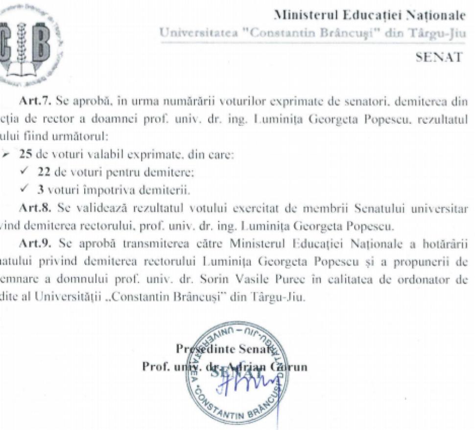 Rectorul Universității ”Constantin Brâncuși”, Luminița Georgeta Popescu, a fost demis din funcție potrivit unei hotărâri adoptate în ședința din 27 aprilie. Decizia a fost luată cu 22 de voturi pentru demitere și trei împotrivă. În aceste condiții a fost trimisă o decizie Ministerului Educației, cu propunerea ca profesorul Sorin Purec să preia calitatea de ordonator de credite. În replică, Popescu a declarat în exclusivitate pentru Gorjeanul că eliberarea sa din funcție se face prin ordin de ministru, la fel ca și numirea, ca atare înlăturarea din fruntea instituției de învățământ superior nefiind valabilă în opinia sa, până la o informare oficială din partea MEN. Mai multe detalii și declarația Luminiței Popescu în ediția de mâine! (A.C.)