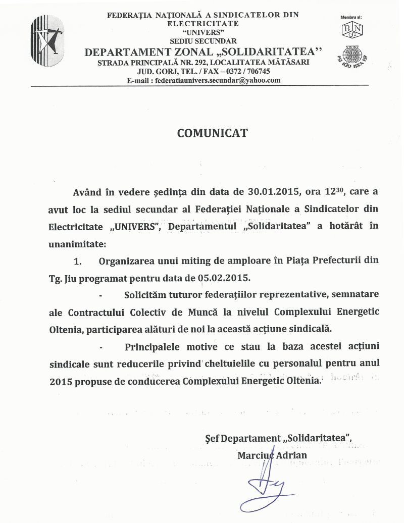 Departamentului lui Adrian Marciuc a solicitat tuturor federaţilor reprezentative, semnatare a CCM-ului, să participe alături de Solidaritatea la această mişcare sindicală. S-a subliniat că principala revendicare a acestei acţiuni de protest este legată de reducerile privind cheltuielile de personal ale CEO pe 2015.