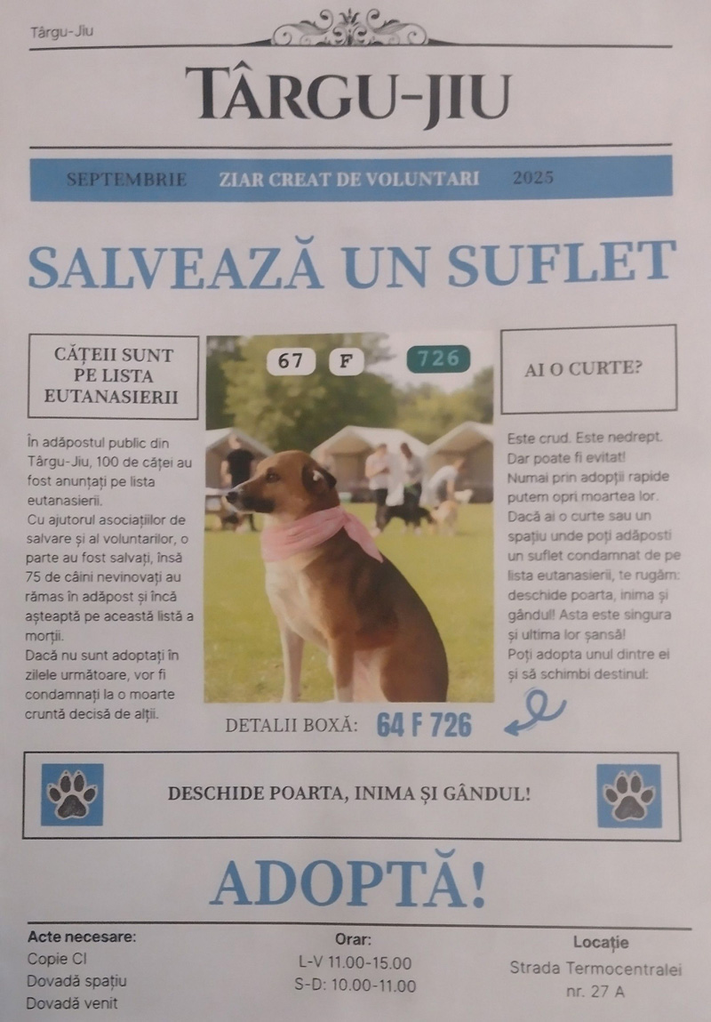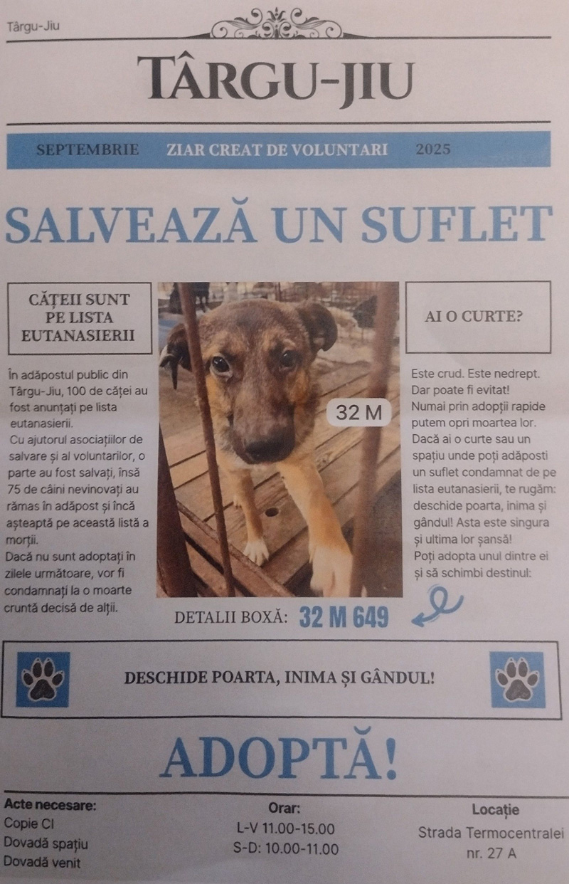 Dacă ai o curte sau un spațiu unde poți adăposti un suflet condamnat la moarte, de pe lista eutanasierii, te rugăm: deschide poarta, inima și gândul! Asta este singura și ultima lor șansă! Poți adopta unul dintre ei și să schimbi destinul!”, este mesajul organizatorilor Campaniei de adopție a animalelor la Târgu-Jiu.