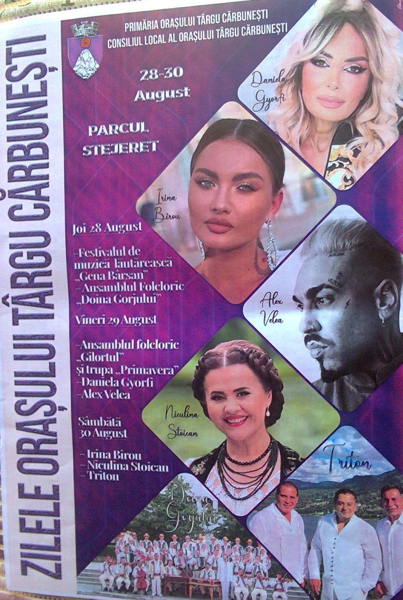 -D.B. Zilele Oraşului se sărbătoresc de circa 20 de ani, pentru că s-a început cu o zi de sărbătoare, Hramul Mănăstirii din ziua de 29 august, apoi s-a ajuns şi la 4-5 zile, iar, pentru că sunt aceste măsuri de austeritate, vom încerca să sintetizăm în cele trei zile! Avem un întreg program cultural-artistic cu această îmbinare între partea religioasă care ţine de sărbătoarea din 29 august, când toată lumea participă la Sfânta Liturghie oficiată de către Înaltpreasfinţitul Părinte dr. Irineu, Arhiepiscopul Craiovei şi Mitropolitul Olteniei, partea cultural-artistică legată de folclor, care se va desfăşura în pădurea «Stejeret», începând de azi şi până sâmbătă, cu festivalul de muzică populară lăutărească «Gena Bârsan», ca să nu mai spun că sâmbătă şi duminică, va începe o nouă ediţie a campionatului judeţean de fotbal, unde participăm cu echipa «Gilortul». Tot sâmbătă şi duminică se va desfăşura o nouă etapă a raliului Cupa «Stejeret» de viteză în coastă, ca să avem un tot unitar de manifestări şi toată lumea poate să guste din ceea ce îi place din programul nostru!