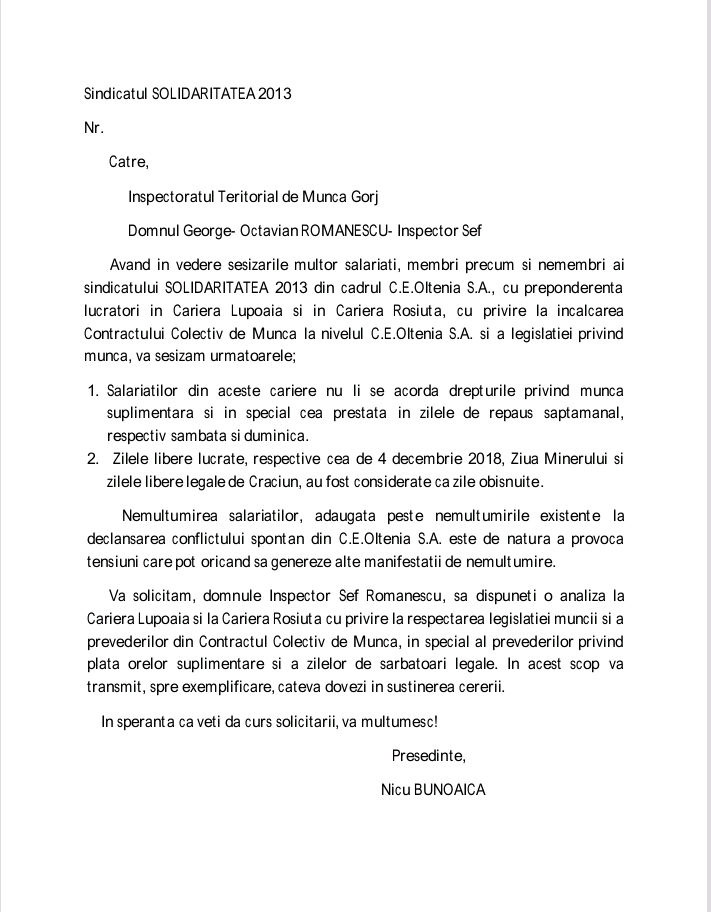 Timp de doi ani de zile, minerii de la CE Oltenia ar fi fost furați la plata zilelor muncite suplimentar, în zilele de sărbători legale ori libere. O spune liderul de sindicat de la Cariera Lupoaia, Nicu Bunoaica, care a sesizat recent la Ministerul Muncii această problemă gravă, care nu ar fi fost luată în seamă de oficialii CEO. Liderul a exemplificat în sesizarea făcută la București cu un pontaj al unui angajat al unității miniere, care era diferit de fișa de salariu al minerului din calculator. În pontaj se vede că omul muncea într-o anumită zi, iar în pontajul de pe calculator figura în zi liberă suplimentară, ziua în cauză fiind neplătită. Situația s-ar regăsi la aproape tot personalul productiv din această unitate minieră.