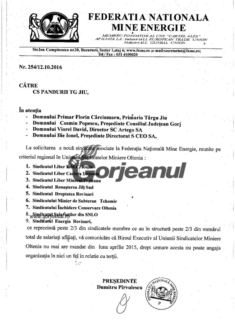 De altfel, vorbele lui Morega parcă au pus în mișcare și sindicatele din FNME care au legitimitate în privința situației USMO. La câteva ore de la conferința lui Morega, după ce declarațiile fostului deputat au devenit virale în spațiul public, FNME a transmis CS Pandurii un document prin care anunțau acest for, oficial, că nici Condescu și, după cum se vede nici Marin Golea, nu aveau dreptul să semneze documentele care au stabilit intrarea în insolvență a clubului sportiv. Potrivit documentului, FNME anunță CS Pandurii că Biroul Executiv al USMO “nu mai are mandat din aprilie 2015, drept urmare acesta nu poate angaja organizația în niciun fel de relație cu terții”.