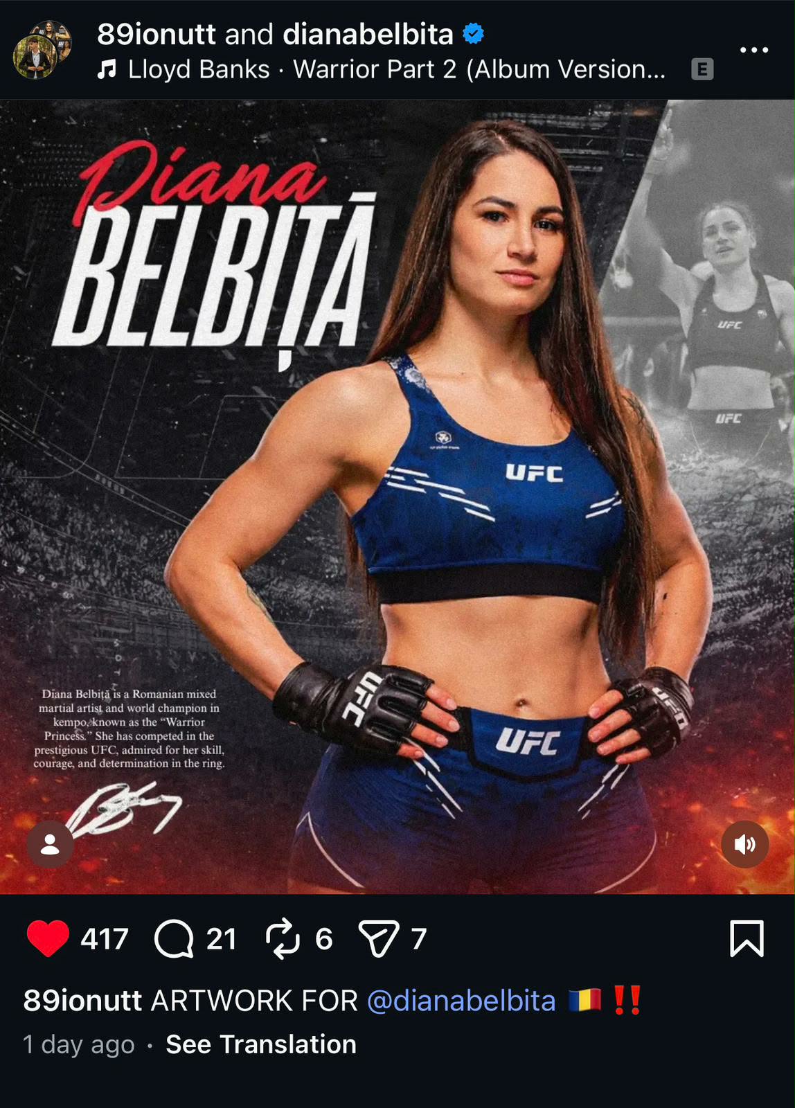 Recent, Ionuț a realizat un proiect pe graphic design și branding pentru Diana Belbiță, sportivă româncă de MMA cu experiență în Ultimate Fighting Championship (UFC), cea mai importantă organizație de arte marțiale mixte din lume. Proiectul a constat în crearea unei grafici de imagine care să reflecte stilul și energia luptătoarei, într-o direcție modernă, adaptată pentru mediul online. Vizualul a fost ulterior postat pe Instagram, în colaborare pe ambele conturi, consolidând astfel prezența digitală a sportivului și oferind un impact vizual puternic pentru fanii săi.