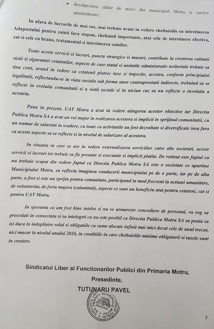 “În speranța că am fost bine înțeles și nu se urmărește concedierea de personal, vă rog să procedați în consecință și să înțelegeți că nu este posibil ca Direcția Publică Motru să poată să își ducă la îndeplinire rolul și obligațiile cu sume alocate infinit mai mici decât anul trecut, nici măcar la nivelul anului 2016, în condițiile în care cheltuielile minime obligatorii și taxele sunt în creștere”, a transmis liderul Sindicatului Liber al Funcționarilor Publici din Primăria Motru.