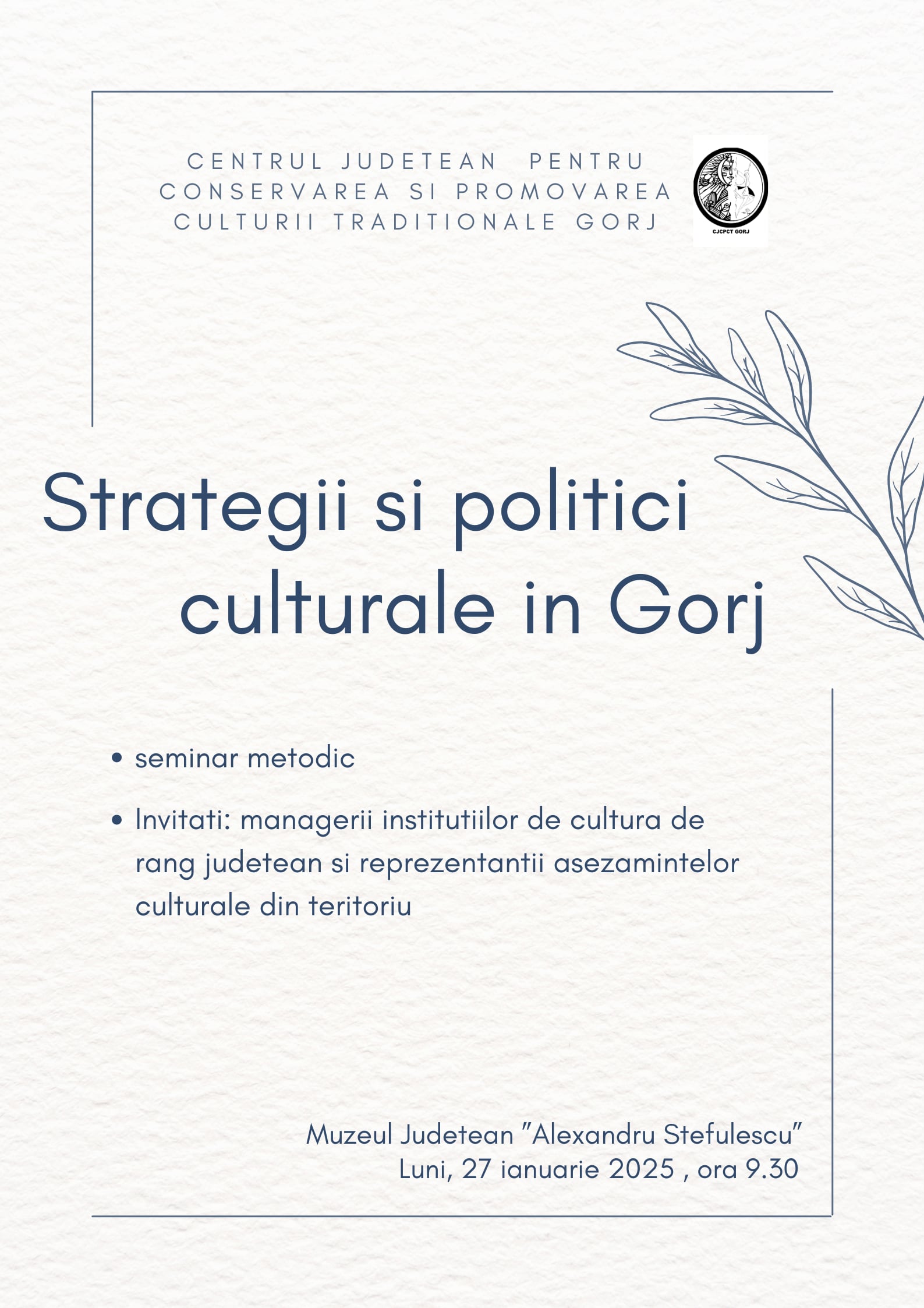 Cea de-a XXI-a ediție a Seminarului metodic „Strategii și politici culturale în Gorj” va avea loc anul acesta, luni, 27 ianuarie 2025, începând cu ora 9.30, la Muzeul Județean „Alexandru Ștefulescu”, din Târgu Jiu.