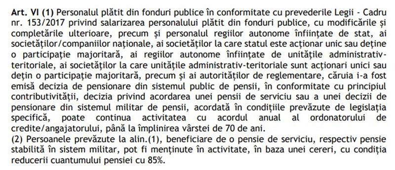 ART VI, alin 2.: Conform alin 2, reducerea de 85%, se aplica doar celor cu pensie speciala si celor cu pensie militară, nu și celor care beneficiază de pensie cu reducerea vârstei standard de pensionare, adică directorilor care au ieșit la pensie la 54 de ani și care pot rămâne în activitate cu salariul de director și cu pensia intreagă, care este aproape tot un salariu.