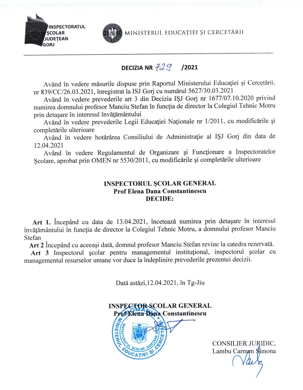 Conducerea IȘJ Gorj a decis astăzi să-l înlocuiască pe Manciu Ștefan din funcția de director al Colegiului Tehnic Motru, decizia fiind emisă. Manciu revine pe funcția de profesor în cadrul școlii. În locul lui Manciu este vehiculat numele unei profesoare din Târgu Jiu, care ar fi refuzat funcția pe motiv că unitatea de învățământ este una cu probleme grave. Schimbată, se pare, este și directoarea adjunctă Adriana Mădălina Pleșă pentru care s-ar fi găsit înlocuitor un profesor de sport de la Școala Gimnazială nr.1 Motru, membru PNL.