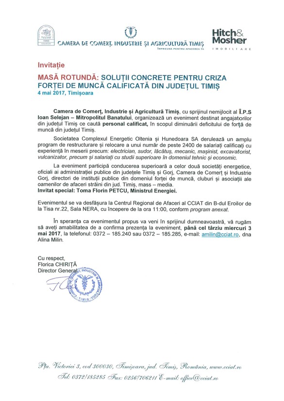 Pe data de 4 mai, Camera de Comerț, Industrie și Agricultură Timiș, cu sprijinul Î.P.S Ioan Selejan, Mitropolitul Banatului, va organiza în Timișoara un eveniment destinat angajatorilor din județul Timiș ce caută personal calificat, în scopul diminuării deficitului de forță de muncă din acest județ. “Societatea Complexul Energetic Oltenia și Hunedoara SA derulează un amplu program de restructurare și relocare a unui număr de peste 2400 de salariați calificați cu experiență în meserii precum: electrician, sudor, lăcătuș, mecanic, mașinist, excavatorist, vulcanizator, precum și salariați cu studii superioare în domeniul tehnic și economic”, se arată în invitația organizatorilor, postată pe site-ul Camerei de Comerț, Industrie și Agricultură Timiș.