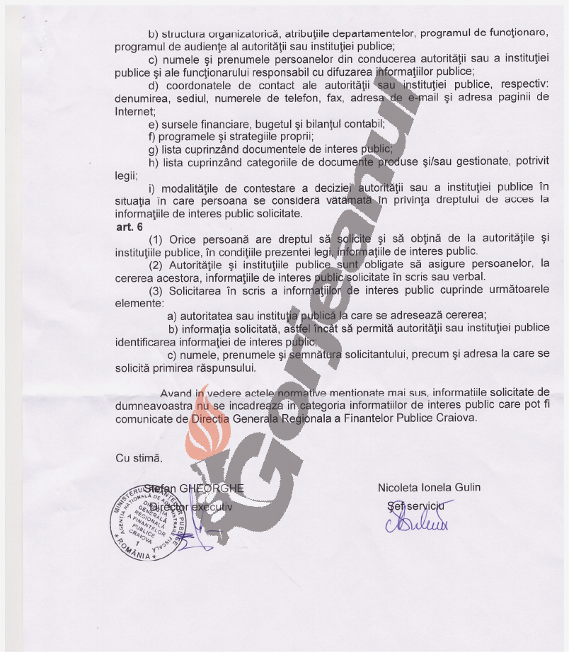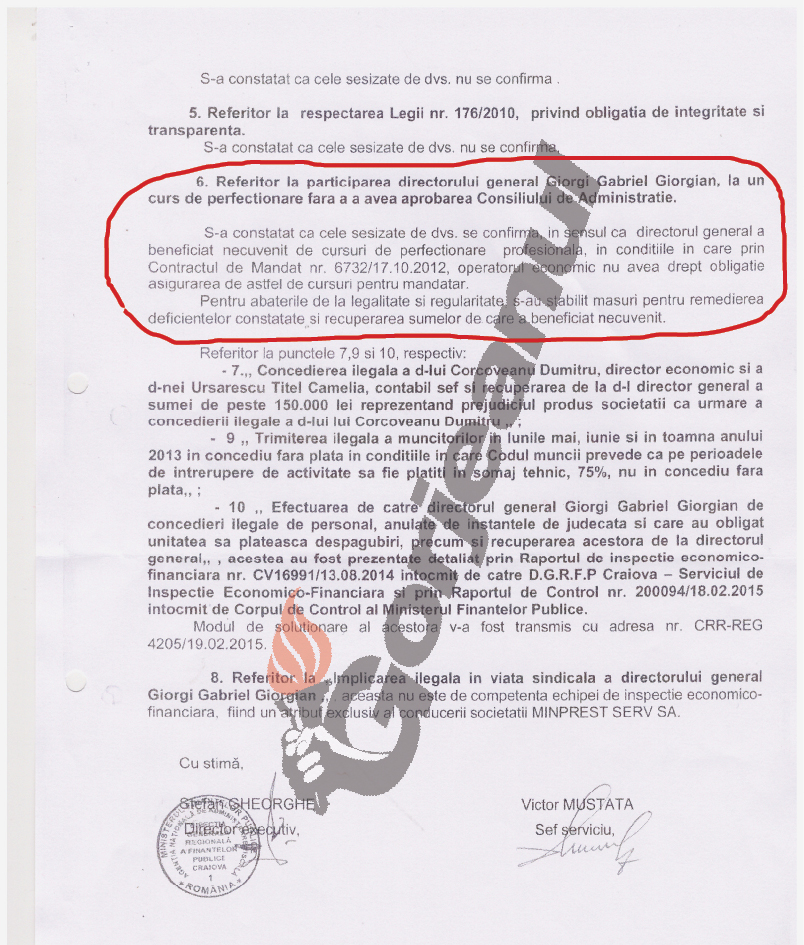 S-a confirmat, în schimb, faptul că Giorgi nu trebuia să participe la cursul de perfecţionare în cauză(fapt relatat şi de presă la momentul respectiv), lucru transcris de organul de control chiar în comunicarea trimisă reclamanţilor, cu câteva luni în urmă. “S-a constatat că cele sesizate de dumneavoastră se confirmă, în sensul că directorul general a beneficiat necuvenit de cursuri de perfecţionare profesională, în condiţiile în care prin Contractul de Mandat nr.6732/ 17.10.2012, operatorul economic nu avea drept obligaţie asigurarea astfel de cursuri pentru mandatar. Pentru abaterile de la legalitate şi regularitate, s-au stabilit măsuri pentru remedierea deficienţelor constatate şi recuperarea sumelor de care a beneficiat necuvenit”, se arată în documentul DGFP Gorj nr.CV3352 din 31 iulie 2015.