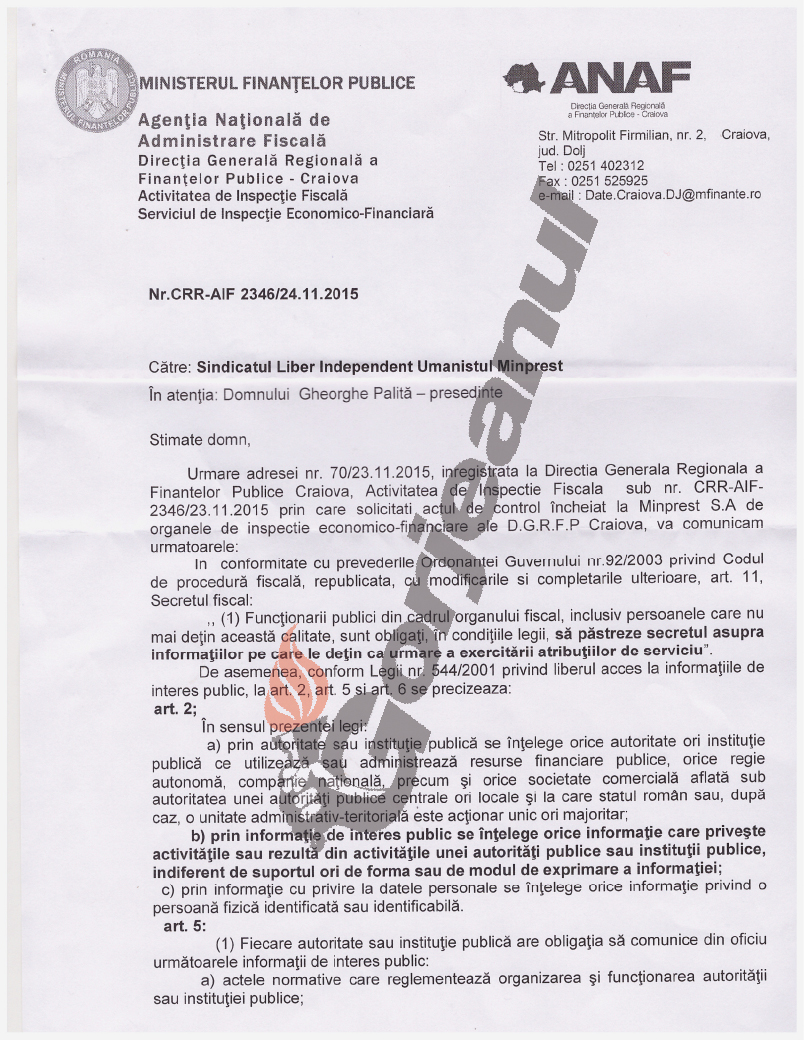 În luna februarie, reprezentanţii Sindicatului Umanistul din cadrul Minprest, sindicat din care a făcut parte cu ani în urmă şi actualul director al societăţii, îl reclama, printre altele, la DGFP Craiova pe Gabriel Giorgi pe motiv că acesta a participat la un curs de perfecţionare fără acordul Consiliului de Administraţie al societăţii. La cinci luni de la sesizare, la sediul Minprest s-au deplasat doi inspectori de la Finanţe, Ion Manciu şi Emil Vlădulescu, care au verificat cele sesizate de sindicalişti, o mare parte dintre cele reclamate, multe legate de numirea directorilor adjuncţi ai societăţii, de planul de management, de transparenţă şi integritate neconfirmându-se la faţa locului.